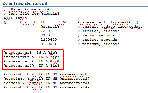 Contoh sederhana: ns1.domainanda.com dan ns2.domainanda.com adalah dua nameservers yang baru saja Anda buat tadi dengan IP 145.678.92.10 (misalnya). Agar domain client bisa diarahkan ke server Anda, 2 custom nameservers tadi + IP server harus ditambahkan ke DNS zone domain client Anda. Jadi, record tambahan seperti ini:Tambahan record untuk nameservers Anda itu tidak otomatis dibuat. Jadi setiap kali Anda create account, harus menambah record tersebut secara manual. Di menu ini, kita akan mengubah default zone. Sehingga nanti pada saat Anda membuat account, tidak harus menambah record manual. Di sana ada 3 pilihan. Simple, standard, dan standardvirtualftp. Kita mulai dari standard. Secara deafult, standard zone template seperti ini, kan?